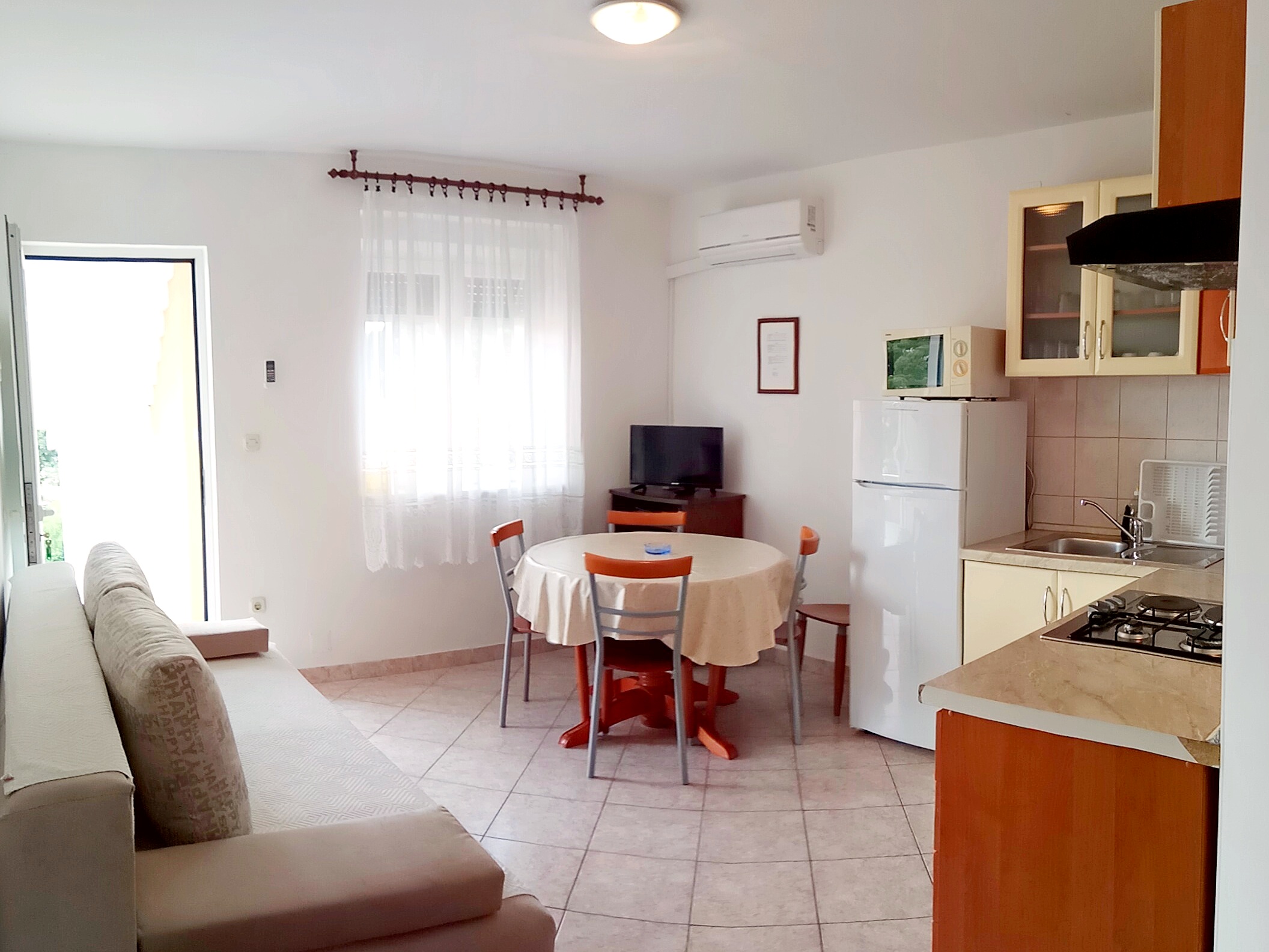 The apartment is located on the second floor. It has one bedroom, kitchen, living room, bathroom and terrace on the south side overlooking the sea and the other is common on the north side overlooking the courtyard and Velebit.