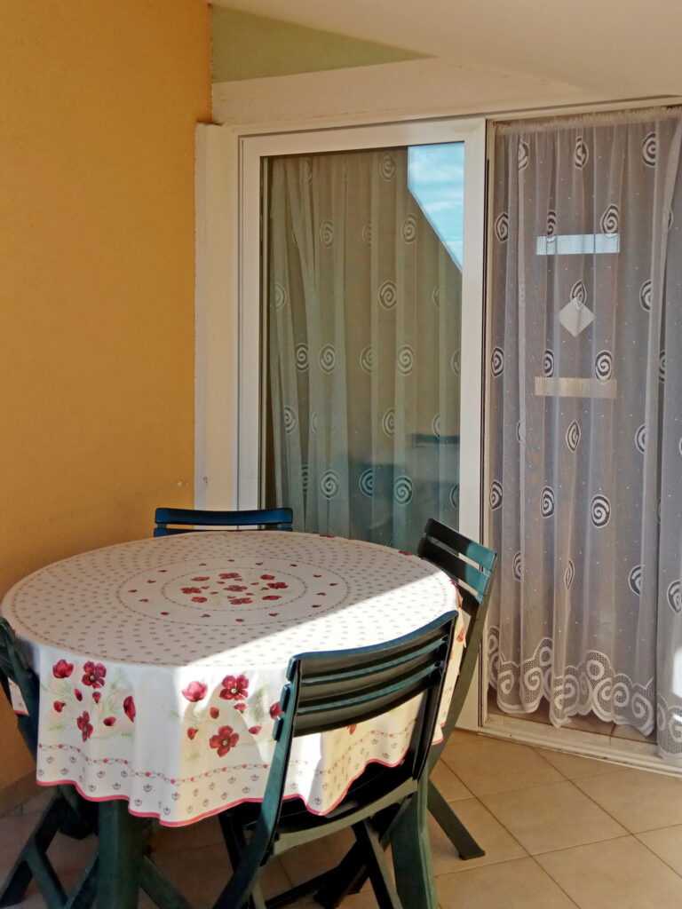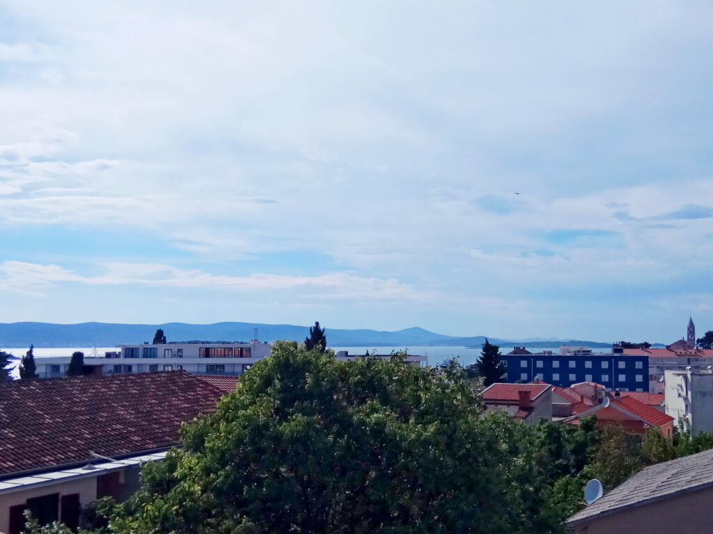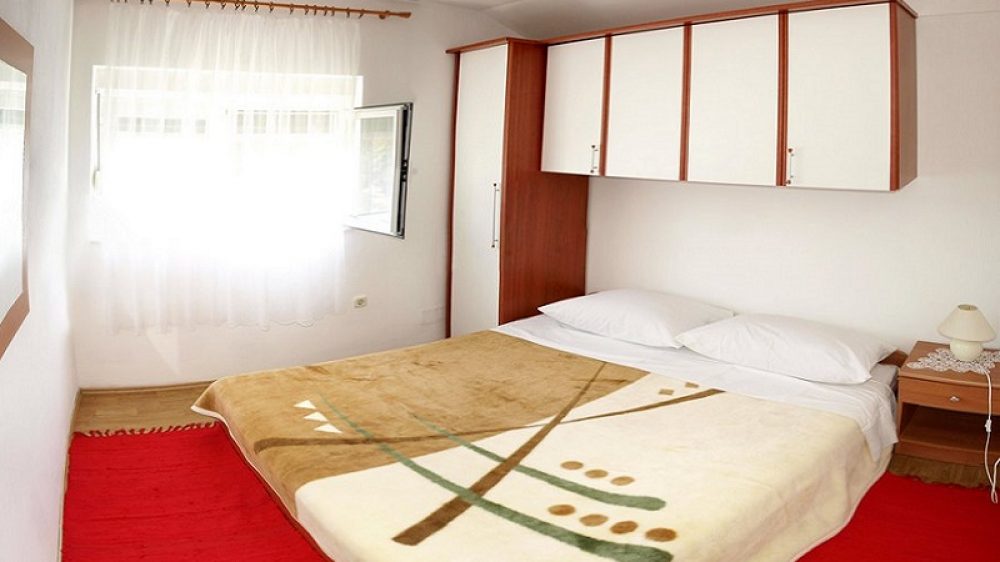 The apartment is located on the third floor. There are two bedrooms, kitchen, living room, bathroom, terrace on the south side with sea view and a common terrace on the north side overlooking the courtyard and Velebit.